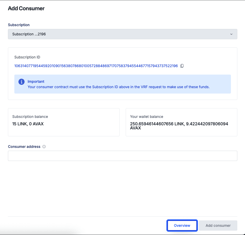 Once on the subscription manager, create a new subscription. The subscription will have a unique ID, which you'll need to reference in your CrossChainVRFWrapper contract. This ID is used to track your random word requests and the balance associated with them.